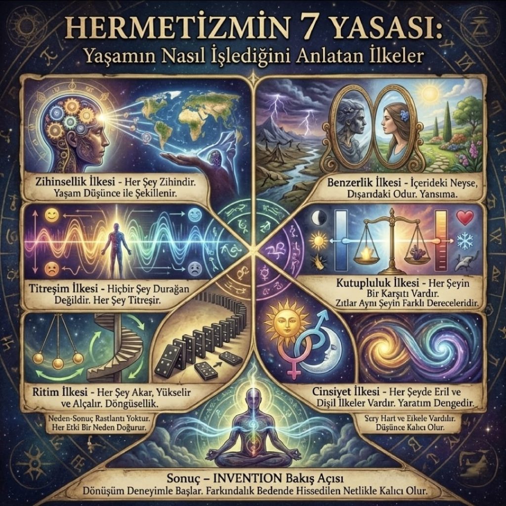 Hermetizmin 7 Yasası, sadece evrenin nasıl işlediğini değil, aynı zamanda insanın “biyolojik fabrikasının” nasıl yönetileceğini anlatan bir kullanım kılavuzudur. Bu yasalar, bizi Tutsak Zihin (Limbik Sistem) döngüsünden çıkarıp, Özgür Zihin (Neokorteks) frekansına taşıyan basamaklardır. İnsan bu yasaları kavradığında, hayatta kalmaya çalışan biyolojik bir otomat olmaktan çıkar; kendi nörokimyasını yöneten ve düşüncesinin rotasını çizen bir kaptana dönüşür.